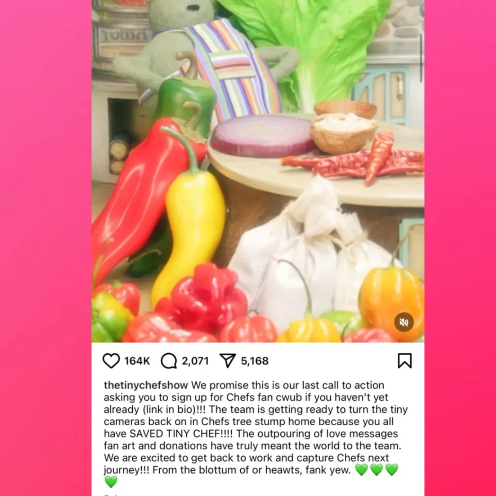 In a new Instagram post from the official The Tiny Chef Show social media account, the titular character revealed that the campaign to save the series was a success, “We promise this is our last call to action asking you to sign up for Chefs fan cwub if you haven’t yet already. The team is getting ready to turn the tiny cameras back on in Chef’s tree stump home because you all have saved the Tiny Chef! The outpouring of love messages, fan art, and donations have truly meant the world to the team. We are excited to get back to work and capture Chef’s next journey! From the biottum of or heawts, fank yew.”