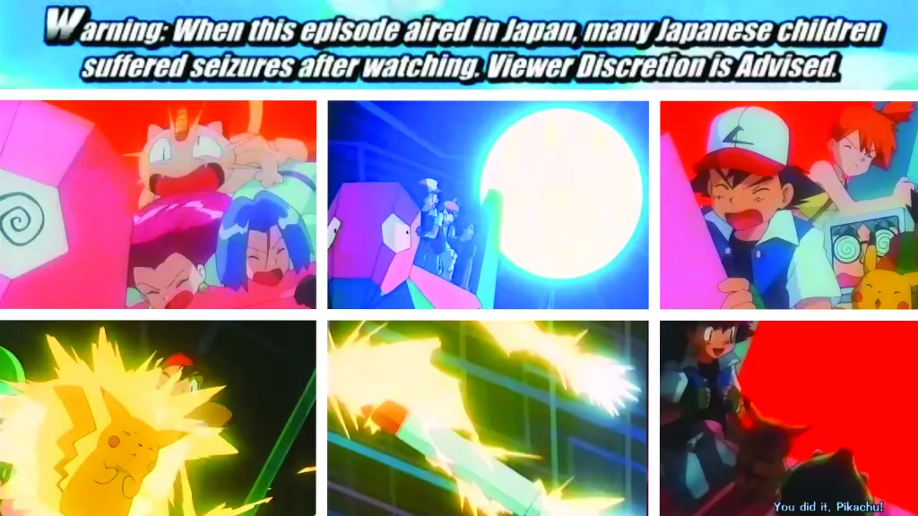 6:51:34 pm, December 16th, 1997. Upon Pikachu’s Thunderbolt attack on the missiles, this first and only broadcast of the episode unleashed the red and blue strobe effect explosion that caused many viewers in Japan to suffer epileptic seizures, vomiting, irritated eyes, and other related symptoms, hospitalizing over seven hundred and starting a mass hysteria that affected over twelve thousand. The episode was pulled from airing and was the only aired episode to have been banned internationally, TV Tokyo had to issue a public apology, Nintendo’s stock fell by 12,200 yen, and the anime went on hiatus for four months. The entire ordeal became known as the “Pokémon Shock” incident. So, bad enough for The Guinness Book of World Records to “award” Pokémon with “Most Photosensitive Epileptic Seizures Caused by a Television Show”.