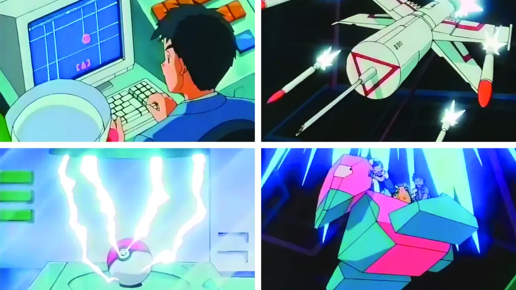 There, the kids meet the CG Pokémon, Porygon, and the professor explains that using an anti-virus software might harm the humans who are trapped in the program. With the help of the professor’s Porygon Unit 01, Ash, Brock, Misty, and Pikachu get into the Transfer Machine so they can go into the program themselves and stop Team Rocket who had stolen the professor’s Porygon Unit 00 and gone into the cyber world try to nab the transferring Pokémon. A bit odd that some anime characters don’t question using human children in the name of scientific progress.