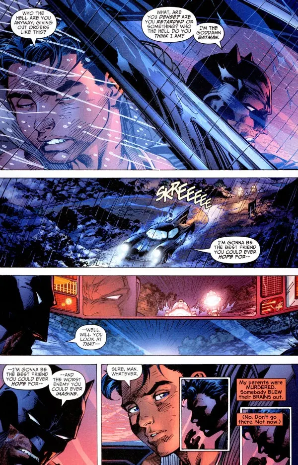 The All Star Batman & Robin, the Boy Wonder series matched Miller โ arguably the most important Batman writer over the past 30 years โ with industry superstar Jim Lee and was met with great anticipation upon its initial publication in 2005. However, the book outraged many fans and critics once they actually read it. Miller’s Batman was depicted as being incredibly violent, to the point of being a sociopath, and extraordinarily cruel to his sidekick Robin. He essentially tortures Robin, withholding food from him and telling him to catch and eat rats. In another scene, he calls his sidekick “retarded” before famously telling him “I’m the Goddamn Batman.” That last line is satirized to this day. But at the time there was legitimate shock from that a book this sadistic and bizarre was actually published under the Batman banner.