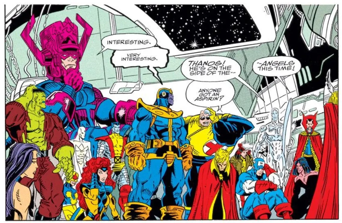 Similar to Darkseid in Cosmic Odyssey, Thanos unexpectedly finds himself aligned with all of the Marvel heroes he had previously tried to kill during the epic Infinity Gauntlet miniseries, in order to fight a common enemy in the sequel, Infinity War.
