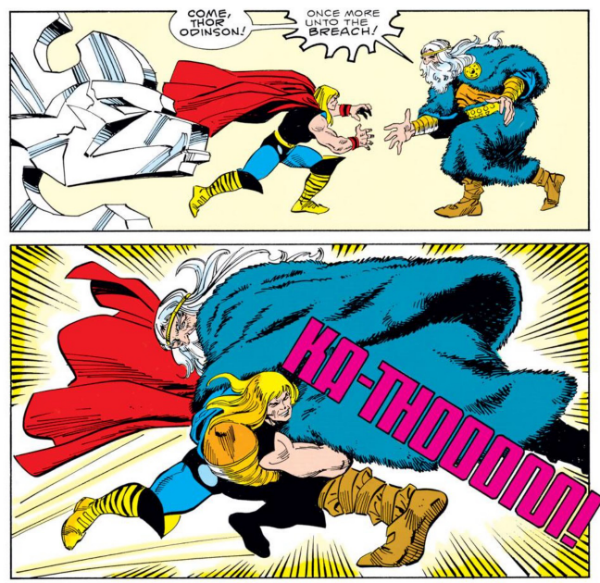 In Thor #355, Thor is (*spoiler alert for 30-year-old comic) freshly mourning the disappearance/presumed death of his father when he encounters an old man inside an icy cave. Through a combination of tough love and spirited competition, the old man lifts Thor’s spirits to the point where he willingly leaves the cave and rejoins his friends and family in Asgard to begin the next phase of his life.