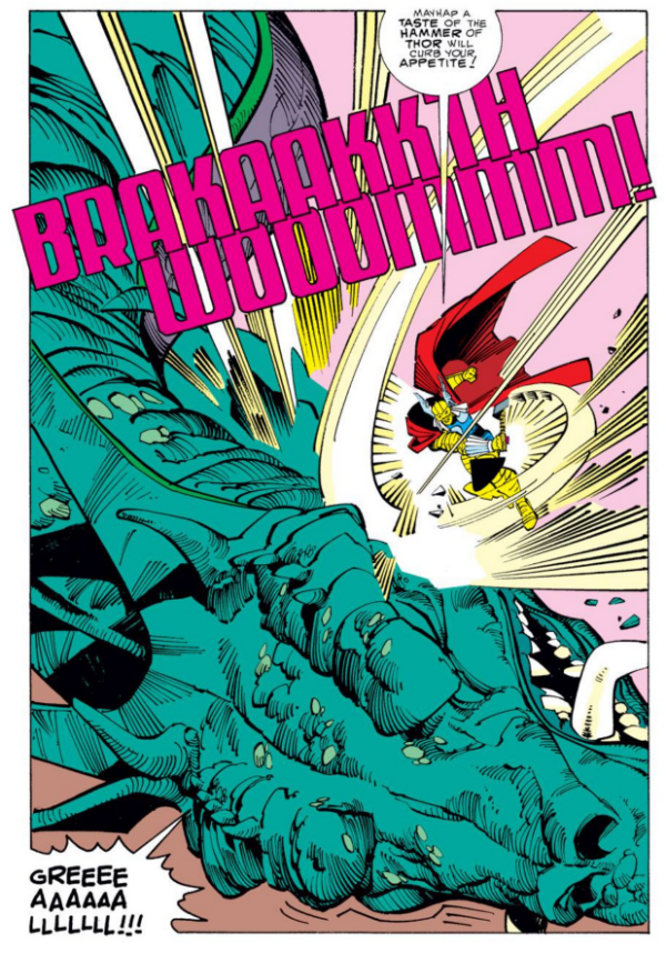 For the final arc of his run, Simonson delivers one last brilliant piece of both writing and artwork when Thor squares off against the World Serpent Jormungand in Thor #380.