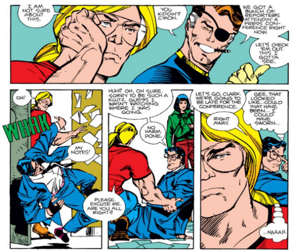 As if the glasses and the “other guy” reference don’t completely sell the joke of Sigurd Jarlson being similar to Superman’s Clark Kent, Thor and Fury bump into a group of reporters, including one that bears an uncanny resemblance to Kent.