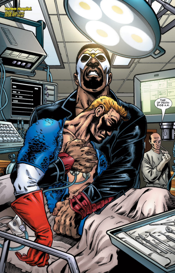 Just as the two finish their argument, a former criminal associate of Wilson’s fires a gun, and the stray bullet hits Captain America. Cap is even believed to be dead for a quick minute, before he is upgraded to “living” and eventually recovers.