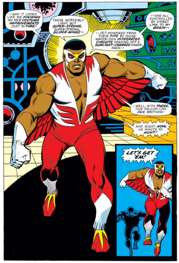 In the midst of Steve Englehart-scripted “Secret Empire” arc – which saw Captain America get framed as part of a larger government conspiracy – Wilson aligns himself with the Black Panther in an effort to expand his powerset and become a more useful ally. The end result of this alliance is a brand new costume for Wilson, which includes a harness and a set of mechanical wings that give him the ability to fly via a direct link to his brain.