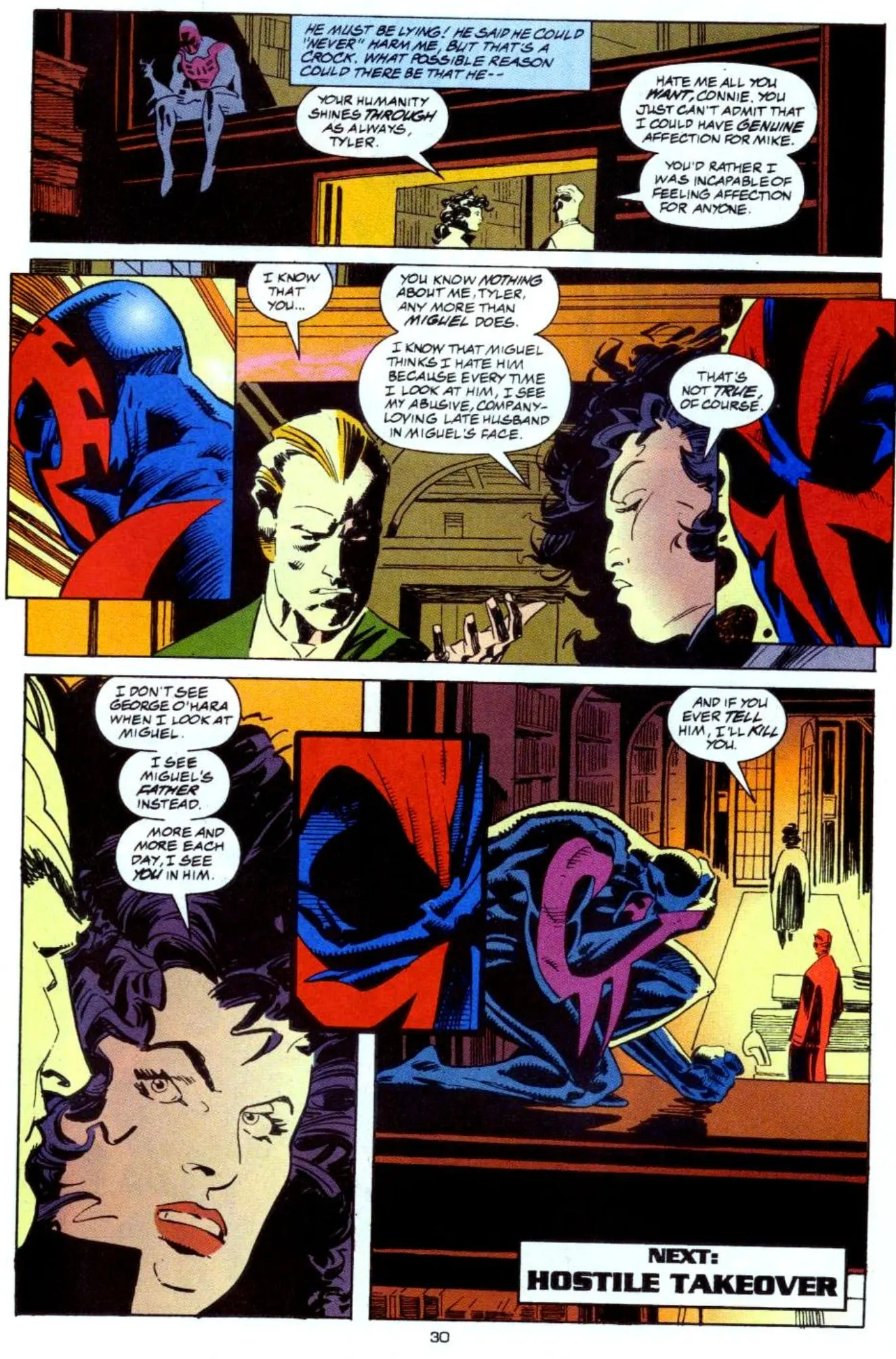 Taking a page from the Empire Strikes Back, the special giant-sized 25th issue of Spider-Man 2099 features a startling โ yet completely logical โ reveal that Tyler Stone, the head of Alechmax and the primary antagonist of the series, is actually Miguel’s father.