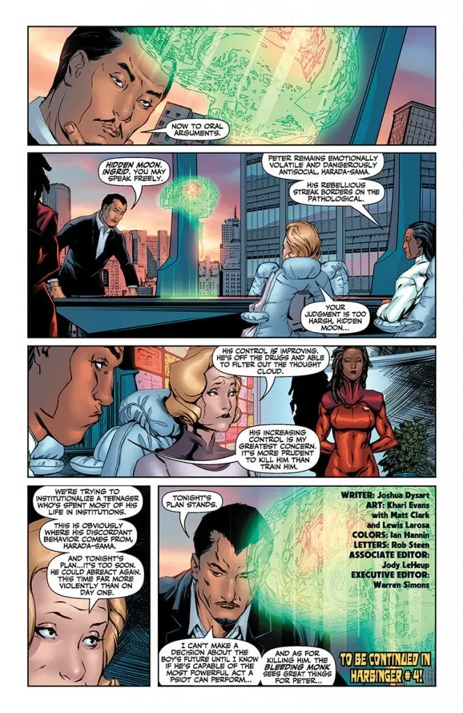 Valiant Entertainment has released an early look at Harbinger #4, coming next week from the publisher. In the penultimate chapter in the title’s first arc, Peter Stanchek is going to kick off a series of events that may bring the Harbinger Foundation to the ground.Check out the preview pages, along with solicitation text for the title, below.