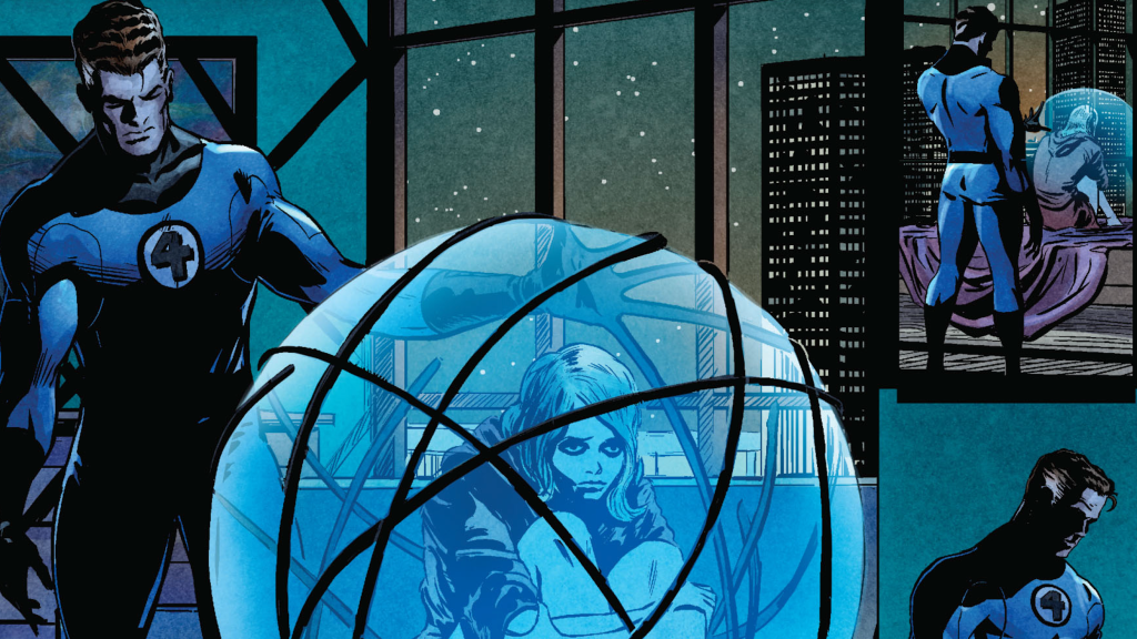 Spanning a month, each member of the Fantastic Four grieves in their own way, which feels realistic and heartbreaking. When Susan learns that her brother is gone, she closes herself off by encasing herself in a force field so Reed can’t touch or comfort her. Reed works in his lab, trying to figure out how to solve all future potential threats to ensure that he doesn’t lose anyone else. He even considers using the Ultimate Nullifier to kill Annihilus, but he ultimately can’t bring himself to do it. Later, Valeria plots to kill her uncle’s murderer. Additionally, Franklin silently grieves alone, with only Spider-Man arriving to comfort him. All of them express realistic forms of grief, ranging from anger to isolation.