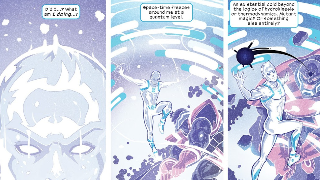 Incredibly, Iceman expands his powerset to freeze space-time itself around him at a quantum level. The idea was subtly teased earlier in Iceman: Omega, when Bobby encountered an ice demon named Ikthalon who did indeed possess the power to freeze time; Iceman discovered he had a natural resistance to that magic, which subtly hints at a connection between Bobby and space-time. What nobody expected, though, was to see Iceman wield a version of this sorcery himself.
