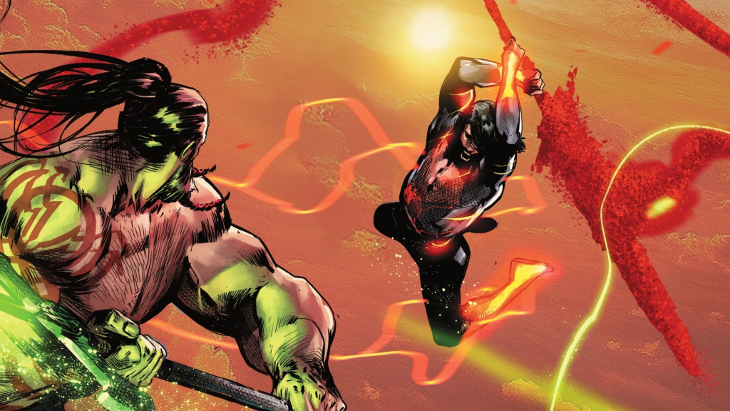 It’s the final battle in Smallville in Absolute Superman #14 by Jason Aaron and Rafa Sandoval. Kal-El has just been stabbed by Ra’s al Ghulโs kryptonite sword. Ra’s al Ghul demands that Superman bend the knee and become his loyal soldier, but the Man of Steel remains defiant. To break Superman, Raโs demands that Brainiac kill Supermanโs friends. But thankfully, what remains of Solโs programming is in Brainiacโs algorithm, and it sacrifices itself to free Lois, Jimmy, and Lana. Superman is enraged at the loss of his longtime companion and fights Raโs with renewed vigor.