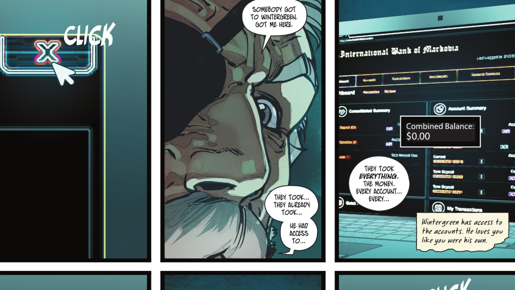 While helping Wintergreen, Slade discovers a note attached to his friendโs body informing Deathstroke that someone is โtaking everythingโ. A nearby computer reveals that all of Sladeโs accounts have been completely zeroed out. Before he can make sense of anything, the remaining hired guns swarm Deathstroke and try to take him out. Worse, a bomb goes off, bringing everything around Slade down. He manages to emerge from the rubble, still outnumbered and outgunned, utterly confused about who stole every penny from him and killed his best friend.