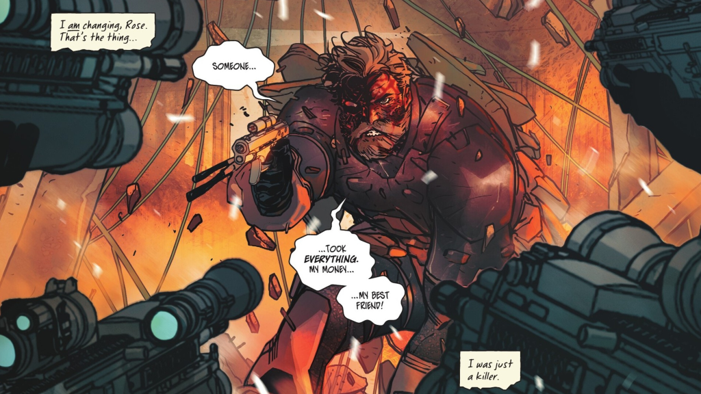 Now obviously, Deathstroke is a monster. From his cold-blooded killing to the way he groomed Terra, there are very few things to like about the guy. But this issue does invite the question of whether Slade is able to change or not. In fact, the first page isnโt of Slade on business, but of Wintergreen and Rose Wilson discussing that very idea. Rose is certain Slade canโt, though Wintergreen has a bit more faith, provided that Slade looks beyond his business and starts trying to mend his relationship with his daughter.