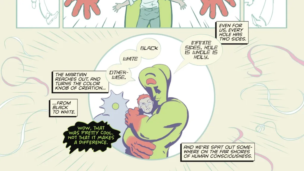 This isnโt the first time that John has done something superhuman in the series. Heโs been mentally connecting to everyone since he first bonded to the Martian. He walked through fire and teleported in issue #3, and punched an intangible man and connected everyoneโs minds in issue #6. However, all of these powers have always been as metaphorical as they have been physical. Thereโs always been the possibility that these powers werenโt actually real, but were just symptoms of Johnโs mental breakdown. Read through the series again, ignoring every supernatural element, and youโll find everything that Johnโs done has been plausible for a normal human with strange flashes of insight.