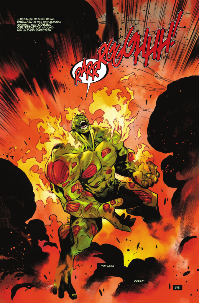 And yes, the Hulk is at the dead center of the asteroidโs landing spot. Everything around the Hulk dies in an instant, and there are species that suffer for days or even months as the planet adjusts after being hit by such a powerful force. And yet, despite the inhospitable environment that multiple species couldnโt survive in, Hulk continues to live, fueled by rage, brought on by the intense pain heโs suffering. The comic keeps up the gruesome details, specifically noting that the world is not hot enough to make the Hulkโs flesh boil.