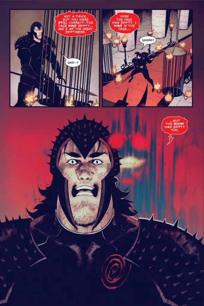 Hela planned to drain Knull of his power until there was nothing left of him, becoming the Queen in Black. She left Knull alone, but in doing so, reminded him of his true power. When the room was empty, Knull simply disappeared. A guard checked his cage, only to find it empty, at which point Knull reappeared and killed him. Knull was the God of Nothing, and so the cage was filled with nothing. With his position as this god, Knull was able to fade away and reappear in another empty location, just as the room. He made his way through Helaโ€™s base, slaughtering her men and reclaiming the symbiotes they wore. Knull made his escape, aiming to restore his lost power, and showed us the coolest exploration of his powers to date.