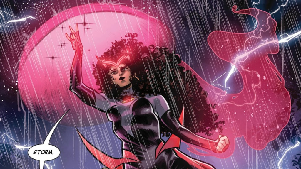 We get another massive clue about what this Age of Magic will look like in Murewa Ayodele and Federica Mancin’s Storm: Earth’s Mightiest Mutant #1 (the third “Shadows of Tomorrow” book published this week). Yet again, this features supernatural threats, although this time spinning out of the recent “Thunder War” arc. But the common thread of magic is there all the same, and this time there’s one further twist; these particular supernatural events have drawn the attention of Scarlet Witch, the new Sorcerer Supreme.