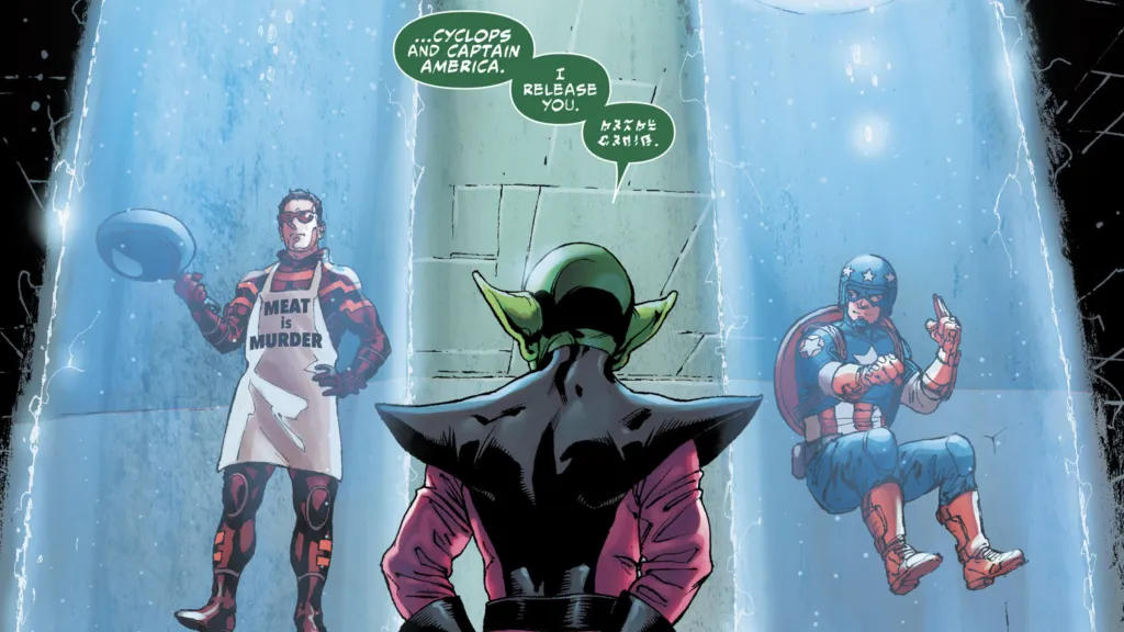 KโThron stole Captain America and Cyclops from whatever they were doing to be on his ship, and froze them in place while he explained the situation. Cyclops, as it were, was cooking, with a frying pan in hand and wearing an apron that said โmeat is murder.โ The literal second the two were free, it was a brawl. Steve went for his shield, and Cyclops tried to beat him with the frying pan. Now, that obviously failed, and the fight continued from there, but I really want you to think about that for a minute.ย