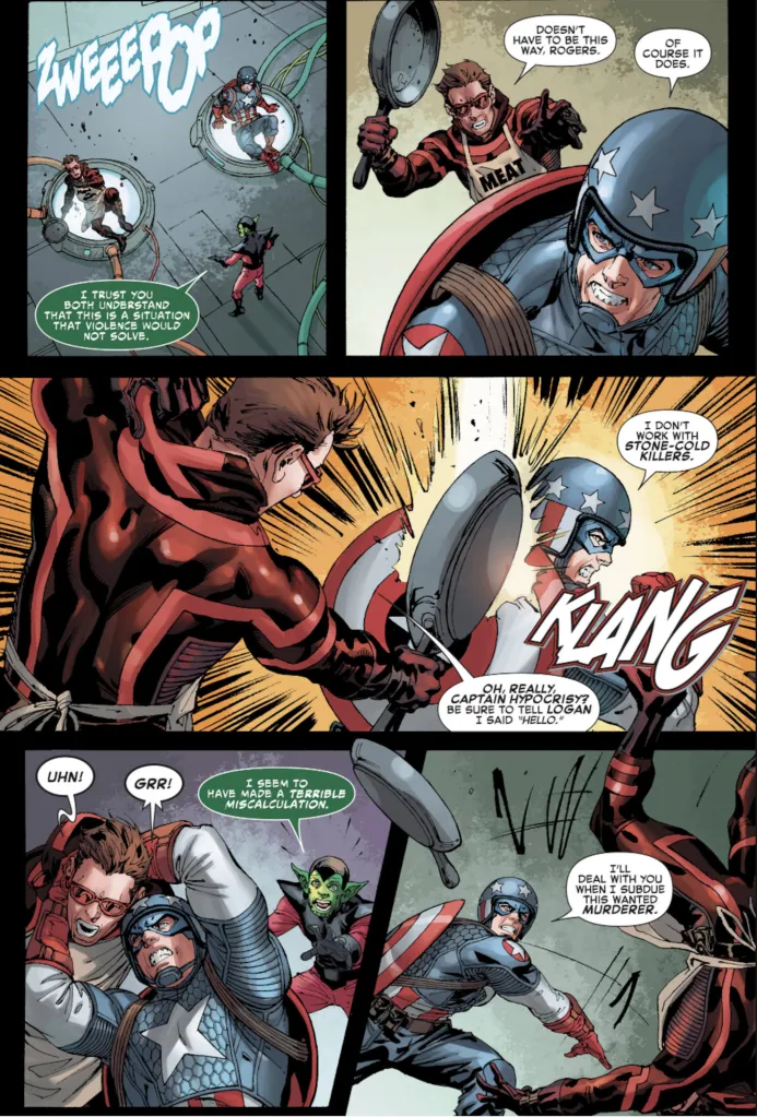 Cyclopsโs power is to constantly shoot blasts of force from his eyes. He couldnโt stop if he wanted to. All he had to do was remove his glasses or even just slightly tilt his head, and he would have blasted Cap with all his might. Instead, Cyclops, the man with infinite range and no physical enhancements, chose to charge the super soldier and whack him with cookware. Cap has super strength, and his main weapon is a shield, but Cyclops tried to smack him with a frying pan instead of using his laser eyes! This is exactly the kind of petty, dirty fighting I love to see, especially in comic books.ย
