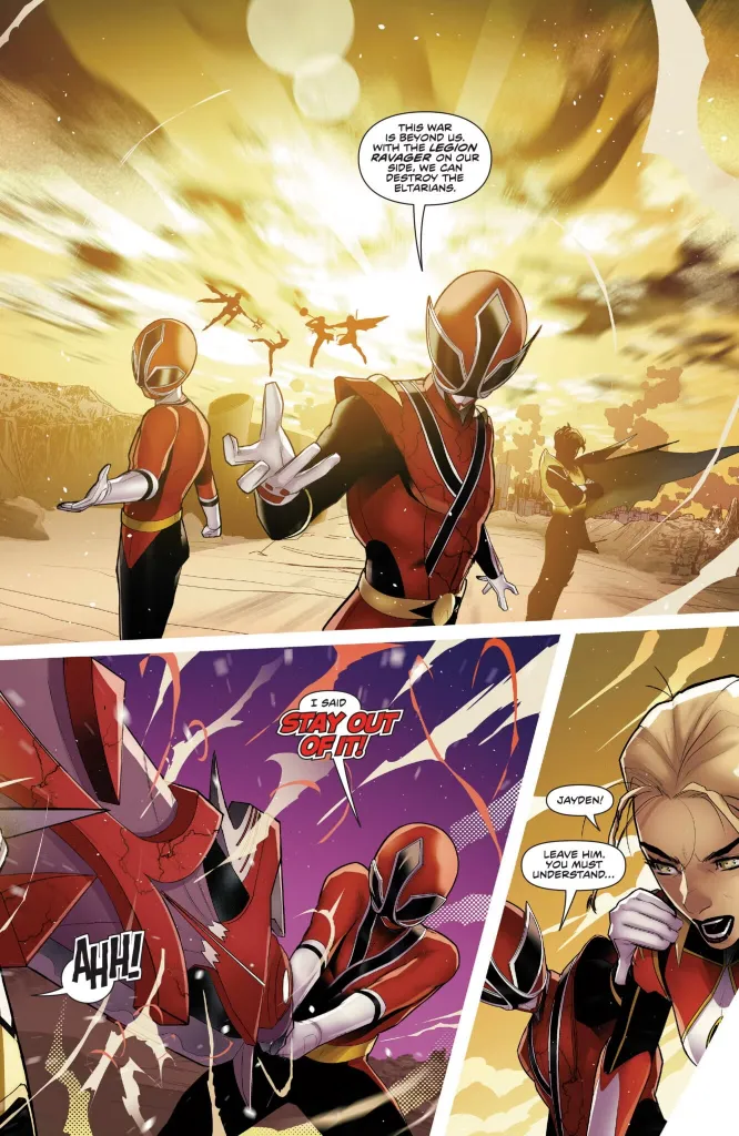 So not only does Lauren have to fight her father as a corrupted Red Ranger, but she also has to fight her younger brother, who she adores and who looked up to her throughout his childhood. There are signs that Jayden can be swayed to defect from the Legion Ravager, but the preview of Power Rangers Prime #16 shows that getting him to abandon his father completely isn’t going to be an easy task. Lauren’s father is still trying to convince her to join his side, but at the expense of everyone on Earth, and that’s not a price Lauren seems willing to pay.