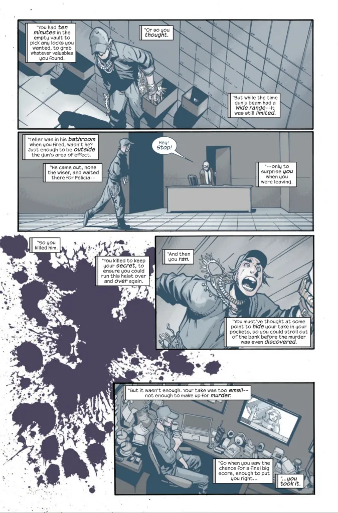 The first page having plenty of panels and narration makes sense, especially since it’s explaining how the murder happened. However, most of that was covered on a previous page, and almost all of the information presented here is already known, just needing to be put together. Similarly, the page where Sue, Alicia, and Felicia talk is very heavy on dialogue, which is necessary to complete their relationship in such a short amount of time. These pages are the best example of the usual compression style. Heavy on panels, dialogue, and narration, all while covering as much story as physically possible.