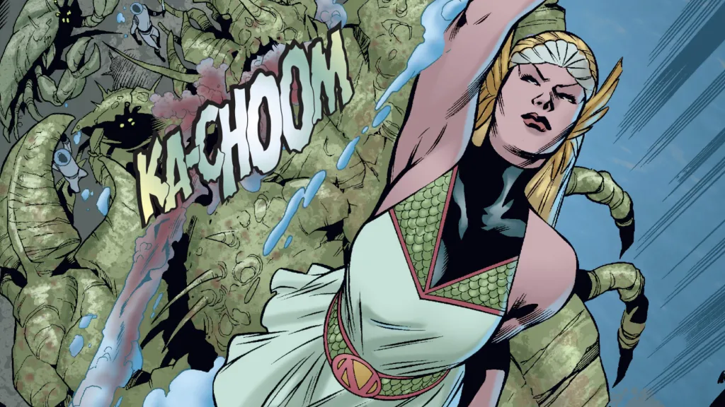 While Namor has been a villain as often as he’s been a hero, his cousin, Aquaria Neptunia, aka Namora, who made her first appearance in 1947, has always been heroic. Namora fights to protect Atlantis and the world from all evildoers. Like her cousin, Namora is a human/Atlantean hybrid who also possesses an X-Gene that gives her powered flight through the small wings on her ankles. With her Atlantean strength, Namora fought the Axis Powers during World War II and has continued as a superhero for decades, serving as both a member of the Avengers 1959 and the Agents of Atlas. Namora is so dedicated to her people that she even led a rebellion against Namor when he became a tyrant over Atlantis.