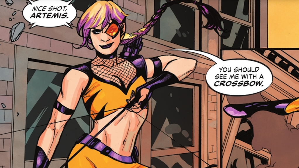 The daughter of Golden Age DC villains Sportsmaster and Tigress, Artemis Crock is a master archer who took on her motherโs mantle and became a longtime enemy of the Justice Society. In her pursuit to destroy the Justice Society, Artemis joined several incarnations of the Injustice Society and even married her villainous teammate, Icicle Jr. However, she has had significant reimaginations. During the New 52 era, Artemis was an ally of the Teen Titans. Fans may also recognize Artemis from her heroic reimagining as one of the main characters in the hit animated series Young Justice, where she was Green Arrowโs former sidekick and was trying to make up for the sins of her parents.