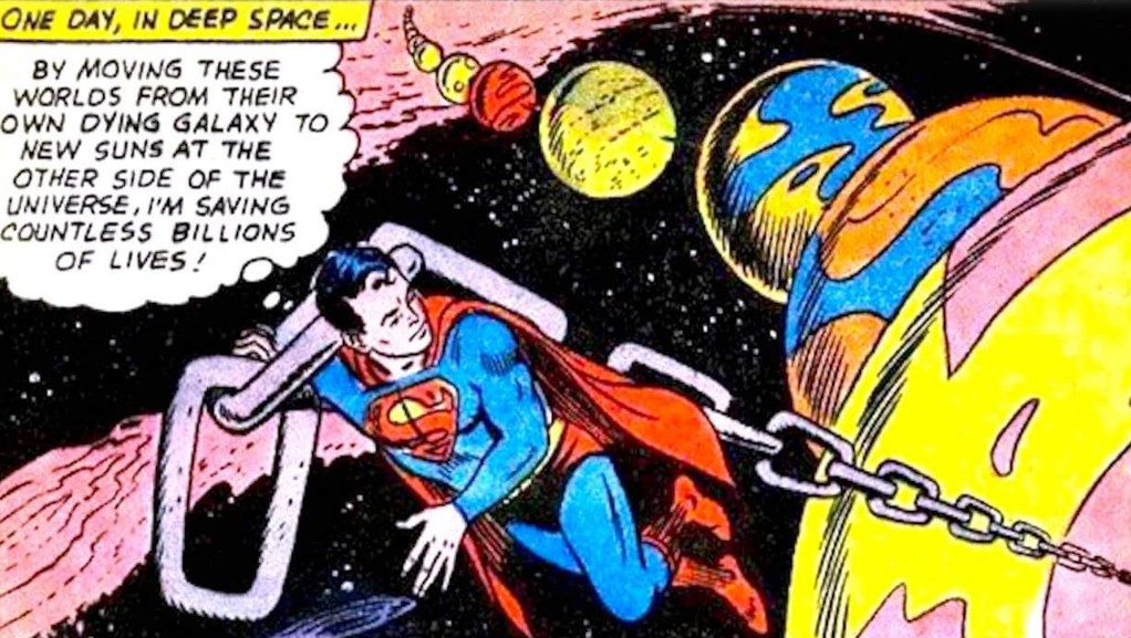 Even when Superman was just a kid going by the name โSuperboy,โ he was casually pulling off mind-boggling feats of cosmic strength. In Superboy #140, a galaxy is reaching the end of its natural life cycle, and its inhabitants are at risk of being destroyed. So, without even breaking a sweat, Superboy connects a giant chain to every single inhabited world in the dying galaxy and tows them out so that he can relocate them to the other side of the universe, where they would be safe. Although no exact number is given for how many planets Superboy was pulling, it was likely at least tens to hundreds of thousands, with billions of lives on each world. For Superboy, though, it was mere childโs play.