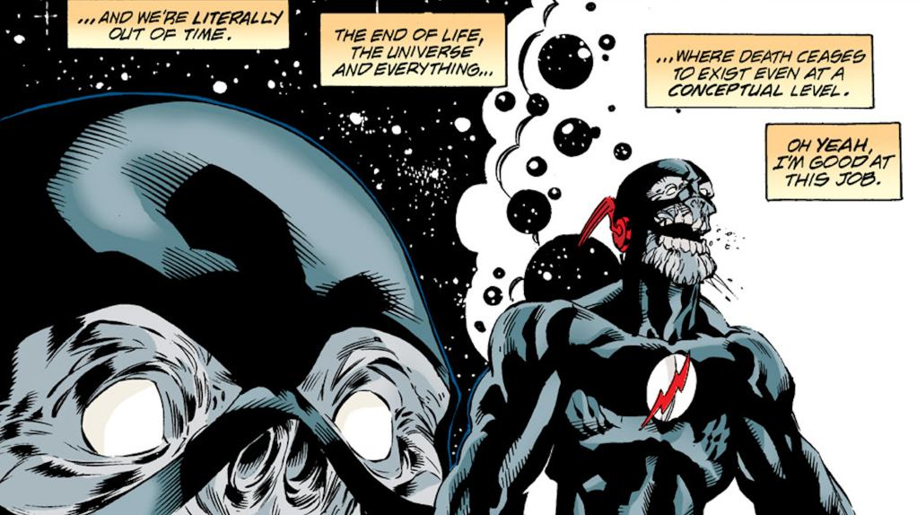 The Black Racer isnโ€™t the only Grim Reaper Wally has had to outrun. The terrifying Black Flash is the physical embodiment of death that focuses on taking the souls of Speed Force users. When Wally was the next on the chopping block in The Flash #141, the Scarlet Speedster must run as fast as he can to avoid the Black Flashโ€™s deadly touch. Wally runs so fast that he travels billions and billions of years into the future to the end of not just the universe, but time itself, where death had no meaning. This causes the Black Flash to dissipate into nothingness. Thatโ€™s right, Wally killed death itself.