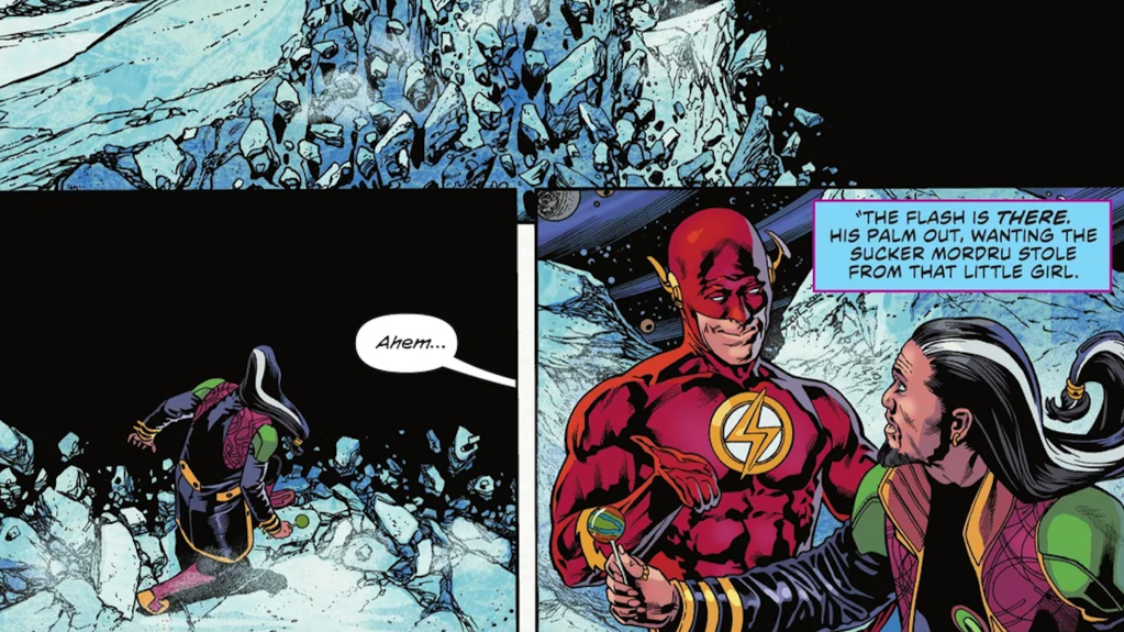 In a moment that exemplifies Wallyโ€™s character, The Flash #800 has him chase a villain across all of time and space. When the wizard Mordru arrives on Earth, he snatches a little girlโ€™s lollipop. Wally arrives on the scene and tries to catch him, but Mordru teleports away to an alien world. However, to Mordruโ€™s horror, Wally had already found him. What follows is a chase that takes them to the age of dinosaurs, the far future, and even a demonic dimension. Yet no matter when or where Mordru teleports, Wallyโ€™s always right on his tail. Finally, Mordru teleports to the end of time itself, only to find Wally already there waiting for him. Wally requests the girlโ€™s lollipop back, and the terrified wizard obliges.