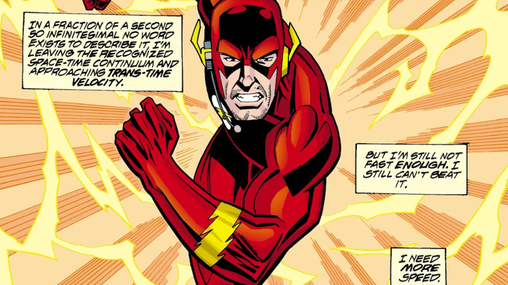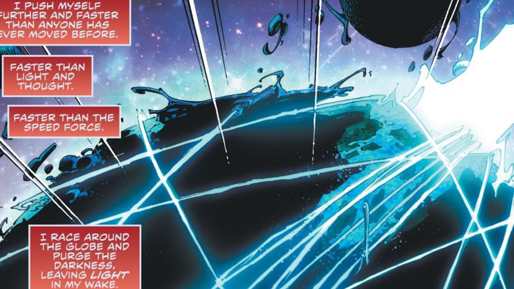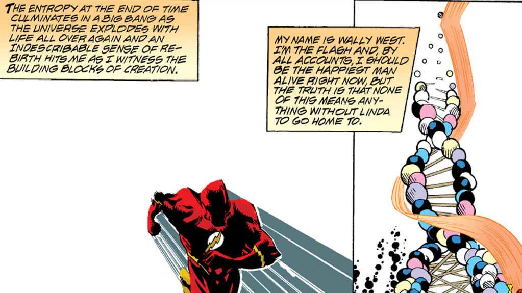 In The Flash #141, Wally wasnโ€™t out of the woods after he destroyed the Black Flash. At the end of time, entropy culminates with the inflationary epoch of the next Big Bang. An inflationary epoch is the near instant creation and expansion of the universe that occurs within a fraction of a second after the Big Bang. To outrun the creation of an entire universe, Wally would have had to run at speeds at least several sexvigintillion times faster than light (thatโ€™s 81 zeroes!). Not only does Wally succeed, but he also travels back in time and saves his fiancรฉe, Linda Park. The fact that he accomplished this immediately after outracing the Black Flash adds even more to the outlandishness of this feat.