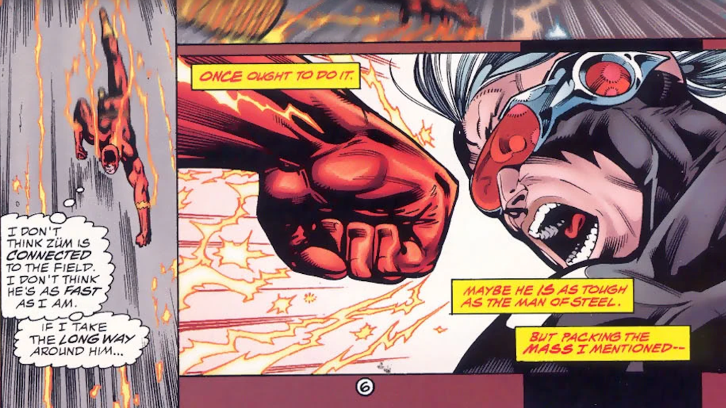 Itโ€™s a well-known that the faster something is moving, the more damage it will do when it crashes into something. In JLA #2, Wally was fighting a villainous speedster called ZรผM and decided to unleash a new technique that he had been developing called the Infinite Mass Punch. By approaching the speed of light, Wallyโ€™s fistโ€™s mass grows to an infinite degree. Later comics would further explore this technique by explaining that the strike has the force of a white dwarf star. Naturally, when Wally hit ZรผM in the face with the Infinite Mass Punch, the villain was sent flying across the planet. Wally would perform this technique several times on villains like the Reverse-Flash and the Anti-Monitor.