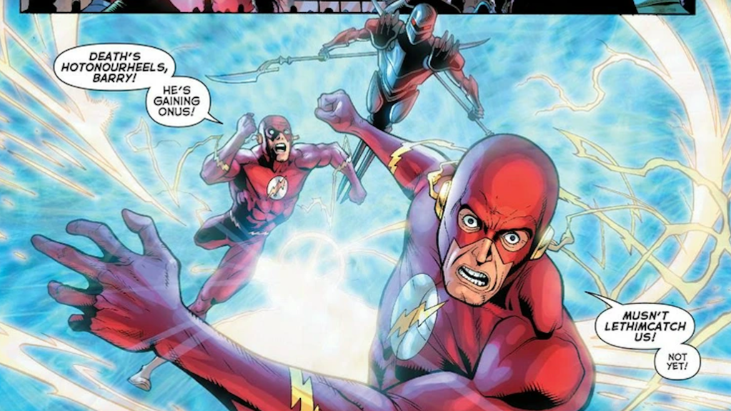 In DC Comics, the New God Black Racer is one of many personifications of death. During the events of Final Crisis, Barry comes back to life after being dead for over 20 years, something the Black Racer wasnโ€™t happy about. However, with the Black Racer chasing Barry, the Flash Family decides to use it to their advantage and stop Darkseidโ€™s plans to conquer the multiverse. Together as they desperately try to avoid the Black Racerโ€™s lethal touch, Wally and Barry surpass superluminal speeds, which is when matter moves so fast that it converts into pure information. Wally and Barryโ€™s plan pays off when they phase through Darkseid, so he is touched by the Black Racer and his soul is taken instead of Barryโ€™s.
