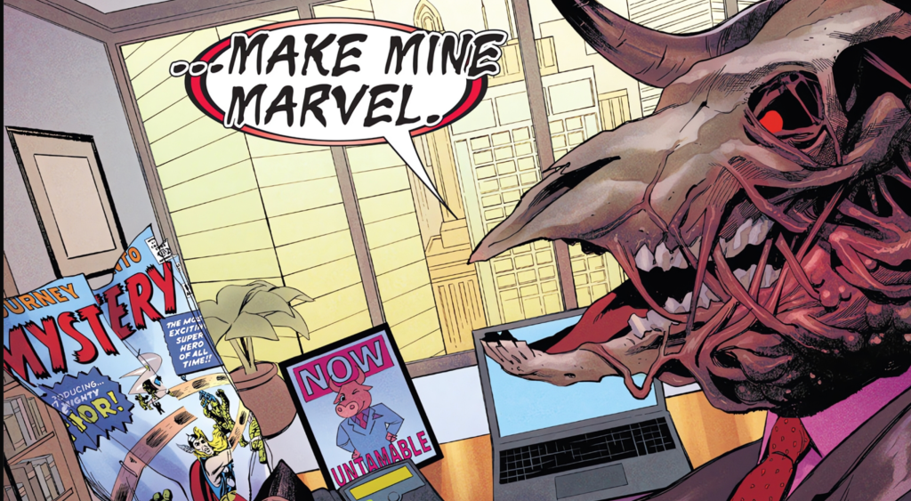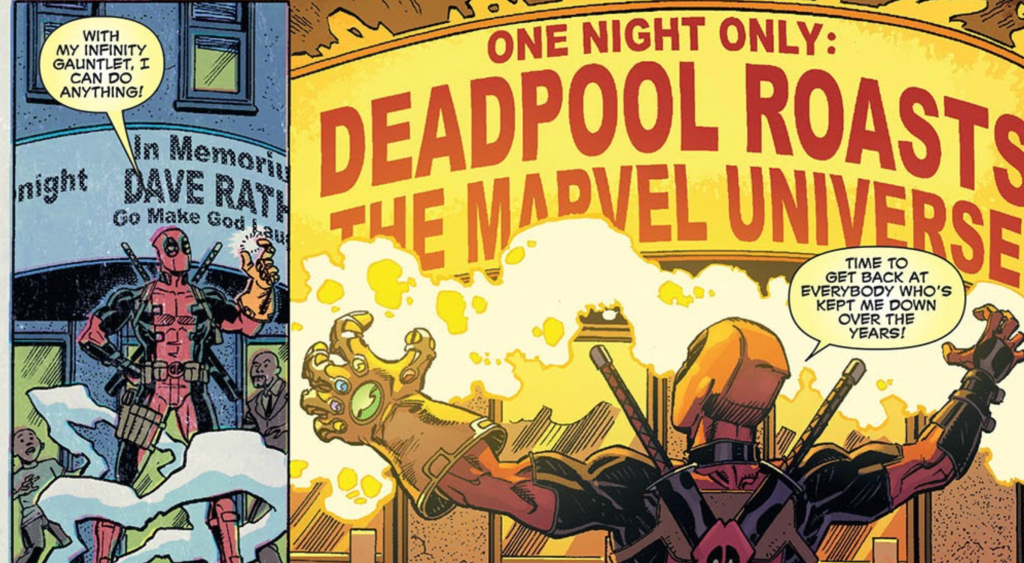 Deadpool is the most famous fourth wall breaker in comics. When the Merc with the Mouth acquires the Infinity Gauntlet, he uses its power to orchestrate a roast battle against everyone in the Marvel Universe. Once Deadpoolโs done making fun of all of Marvelโs most iconic heroes and villains, he takes the opportunity to talk to the reader directly. He says that his knowledge that heโs a comic book character fills him with deep depression. He accuses the reader of using his suffering as a source of entertainment. Itโs a bizarre yet nuanced portrayal of the character that shows his internal suffering.