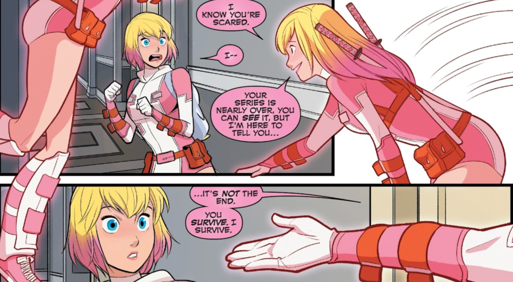 Introduced as a character from the โreal world,โ Gwenpoolโs entire identity is built on the foundation that she knows that sheโs in a comic book. One of her most significant fourth wall-breaking moments is when she discovered that her series, Unbelievable Gwenpool, was to be canceled. The last few issues are dedicated to Gwenpoolโs fear and acceptance of her โdeath.โ However, before Gwenpool and her series end, a future version of Gwenpool appears. She tells the present-day Gwenpool that, as a comic book character, she can never really die. She says that even though the series is ending, Gwenpool will continue to live on as people write about her and read her comics. Itโs a poignant moment that highlights how writers and readers carry on the legacies of fictional characters.