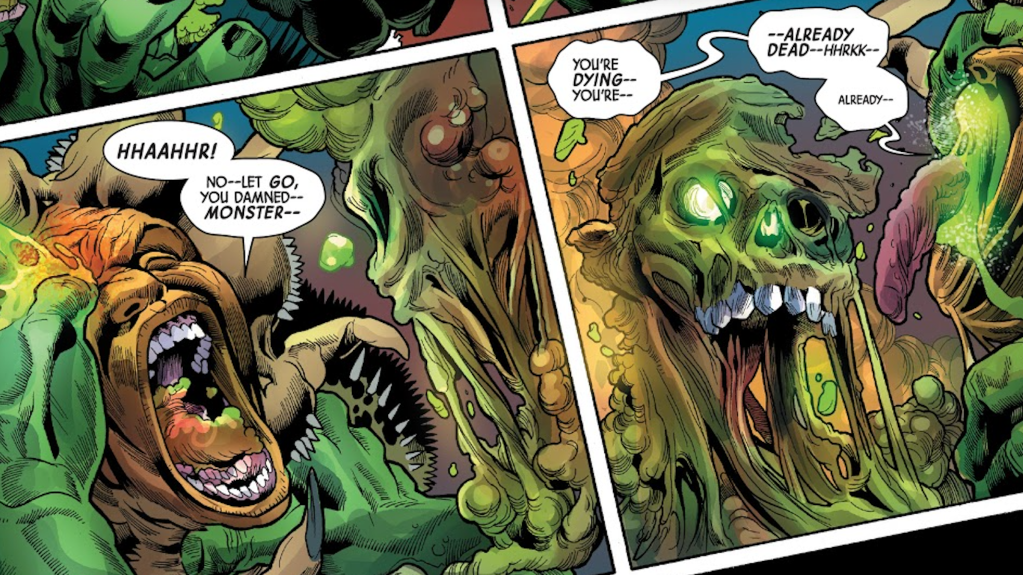 General Reginald Fortean of the U.S. Army sought to weaponize gamma radiation and destroy the Hulk. When Fortean touched the remains of the gamma villain Abomination, the flesh came to life. It absorbed him, turning him into a giant monster. As the new Abomination, Fortean managed to kill the Jolly Green Giant. The dying Hulk took Fortean with him to the afterlife by crushing the villainโs head like a pimple. Since the Hulk and Fortean were both gamma mutants, they both went to the Below Place, where they could respawn by going through the Green Door. However, Bruce Banner, with his Joe Fixit personality in control, ensured that Fortean couldnโt come back to life by snapping his neck, permanently killing him.