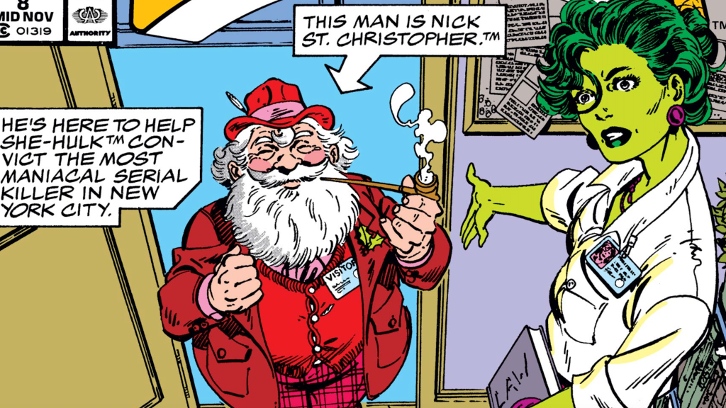 Batman may be the Worldโs Greatest Detective in DC Comics, but in Marvel, that title belongs to an old man named Nick St. Christopher. In Sensational She-Hulk #8, the Hulkโs lawyer cousin is on the hunt for a serial killer. When She-Hulk finds herself in need of help, a jolly old private eye with a long white beard offers a lead in the case. She-Hulk team-ups with Nick. With his knack for sneaking into houses through chimneys and the power to teleport across the planet, Nick helps her bring the killer to justice. While She-Hulk never figures it out, itโs clear that Nick is Santa Claus. The story is a great time, with lots of hysterical fourth wall breaks and references to the holidays.