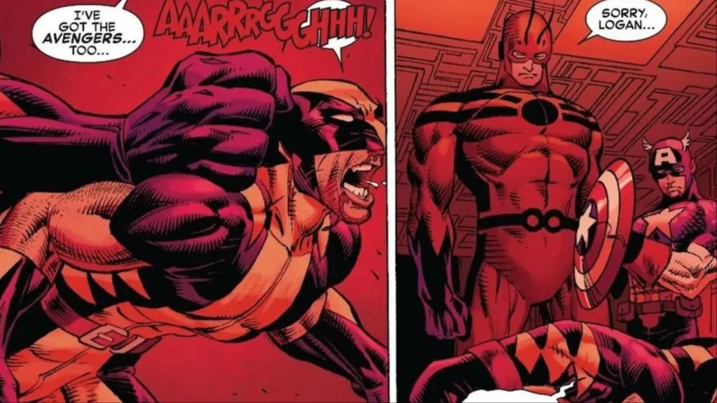 Hank Pym is one of Marvel’s most important heroes, but he hasn’t reached the popularity of some others. He and Wolverine haven’t had too many clashes, and their best is brutally short. Avengers vs. X-Men pit the two teams against each other over the Phoenix Force, with Logan working with Earth’s Mightiest Heroes. Avengers vs. X-Men #4, by Ed Brubaker and John Romita Jr., was advertised as a battle between the ol’Canucklehead and Captain America over the fate of Hope Summers, and it was a slobberknocker. However, Cap had an ace in the hole in the form of Pym. Wolvie got the advantage, but then Pym sucker-punched the mutant. Cap hit him again, and then Pym kicked him out of the Quinjet.