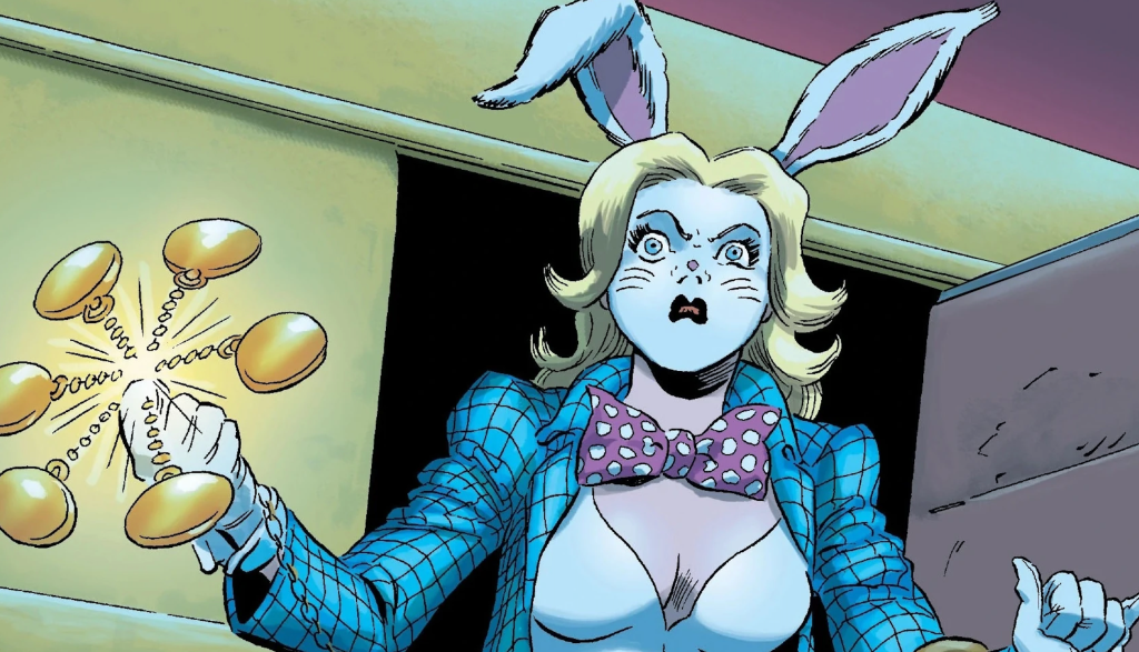 Lorina Dodson left her wealthy upbringing to become a supervillain inspired by the White Rabbit character from Alice in Wonderland. Using an assortment of exploding stopwatches and explosive carrot-firing umbrellas, Lorina has tried her best to become a serious threat, but she always falls short. In her first appearance, she was easily apprehended while robbing a fast-food restaurant by Spider-Man and the D-List hero Frog Man. One of her most ridiculous weapons is a giant mechanical bunny rabbit armed with machine guns, which she rides into battle. With a gimmick and weapons as silly as these, itโs no wonder that, despite Lorinaโs best efforts, no one takes her seriously.