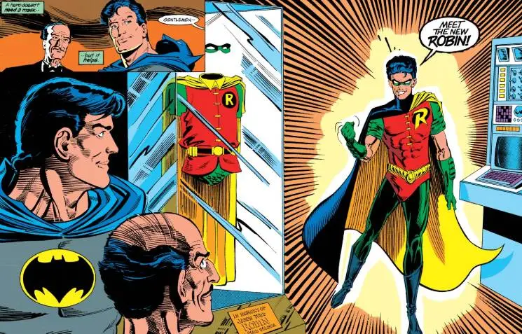 The original Robin suit worn by Tim Drake is the gold standard of the traditional Robin suits. It came with a stronger cape with a black exterior and a yellow interior, proper gauntlets, and pants for once, and was a genuine game changer. Gone are the days of the legs exposed except for pixie boots and green gloves: here we have a Robin ready to fight. In short, the suit offered proof of how to update Robin correctly and also gave him more protection.