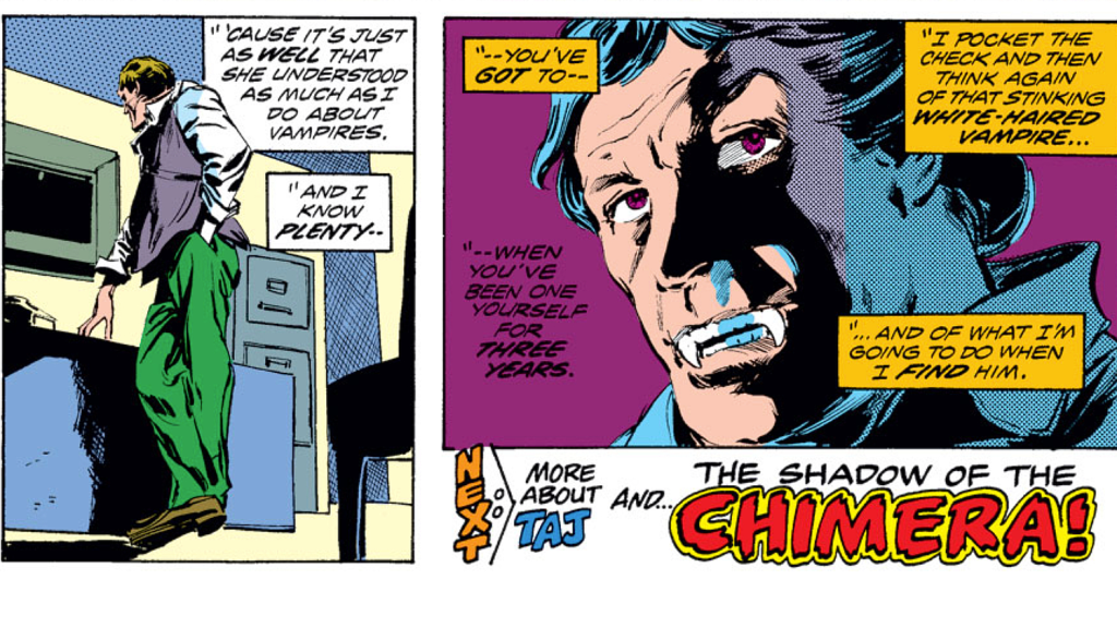 The vampire who most closely resembles Blade, without actually being him, is Hannibal King. As one of the earliest examples of the modern vampire-superhero archetype, King made his debut in Gene Colan and Marv Wolfman’s The Tomb of Dracula #25 (1974.) A private detective who was turned into a vampire by the well-traveled Marvel vampire Deacon Frost, King refused to give in to his vampiric instincts. Instead, he chose to use his newfound powers to hunt other vampires, especially Frost and anyone associated with him. Later, King joined forces with Blade, Ghost Rider, and Morbius to form the Midnight Sons, a team of supernatural heroes dedicated to combating occult and demonic threats.