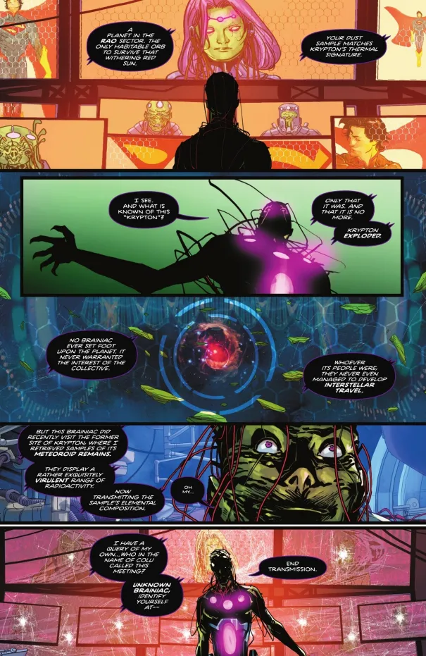 It’s then revealed that no Brainiac ever set foot on Krypton, as it never warranted the Collective’s interest, since they never managed to develop interstellar travel. The Brainiac with this knowledge revealed that they did visit the former site of Krypton and retrieved samples of its meteoroid remains, and they display what is described as a virulent range of radioactivity.