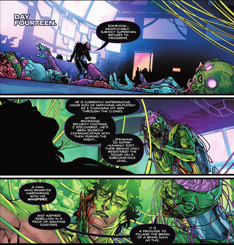 After years of watching his new world kill itself, Superman was captured and tortured by the deranged Brainiac. He put the last Kryptonian through thousands upon thousands of simulations, encouraging him to slaughter his enemies to desensitize him and turn him into a murderer. Superman mentally killed the Science Council of Krypton alongside countless Peacemakers, but no matter how far he was pushed, he refused to kill Brainiac or any innocents. Even while being tortured, he kept whispering to the Brainiac clones that the main one treated them like refuse, inspiring them to try and revolt, even if it ended in failure. Supermanโs resolve couldnโt be broken, but even he has limits. When Lois, Jimmy, and Sam Lane attempted to free him, Superman lived through another vision of the Kents telling him to murder everyone. He finally woke up, then tightened his grip around the smiling villainโs throat and used Sol to rip the building apart.