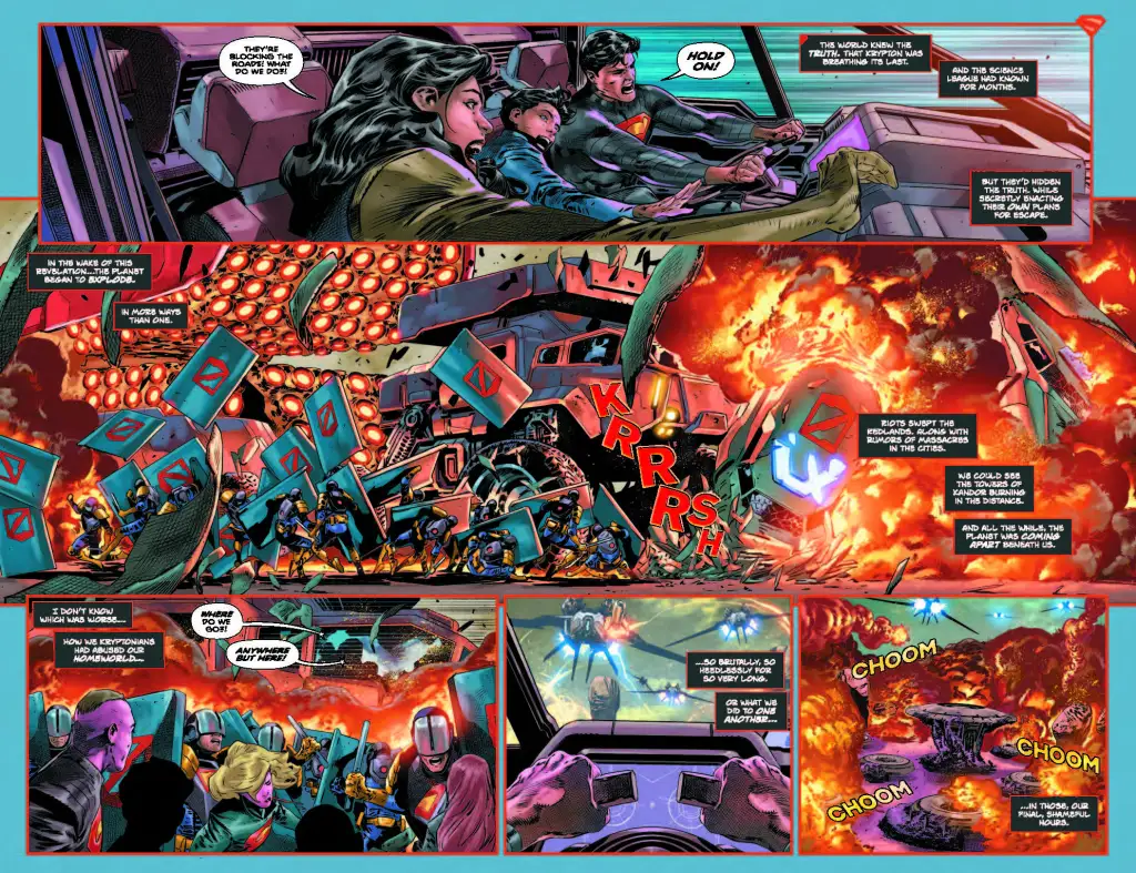 Sandoval, Arreola, and Carey paint a grim and complex picture of Krypton’s final moments. Vivid green explosions from the planet’s very core rip through the all too human chaos caused by the Kryptonian elite’s grasp at survival, all broken up by massive moments of action and intimate moments that remind you of the true cost of greed and self-preservation. The moments leading up to the planet’s destruction feel brutal and difficult to watch, but it’s actually the final few pages that really covey the loss.