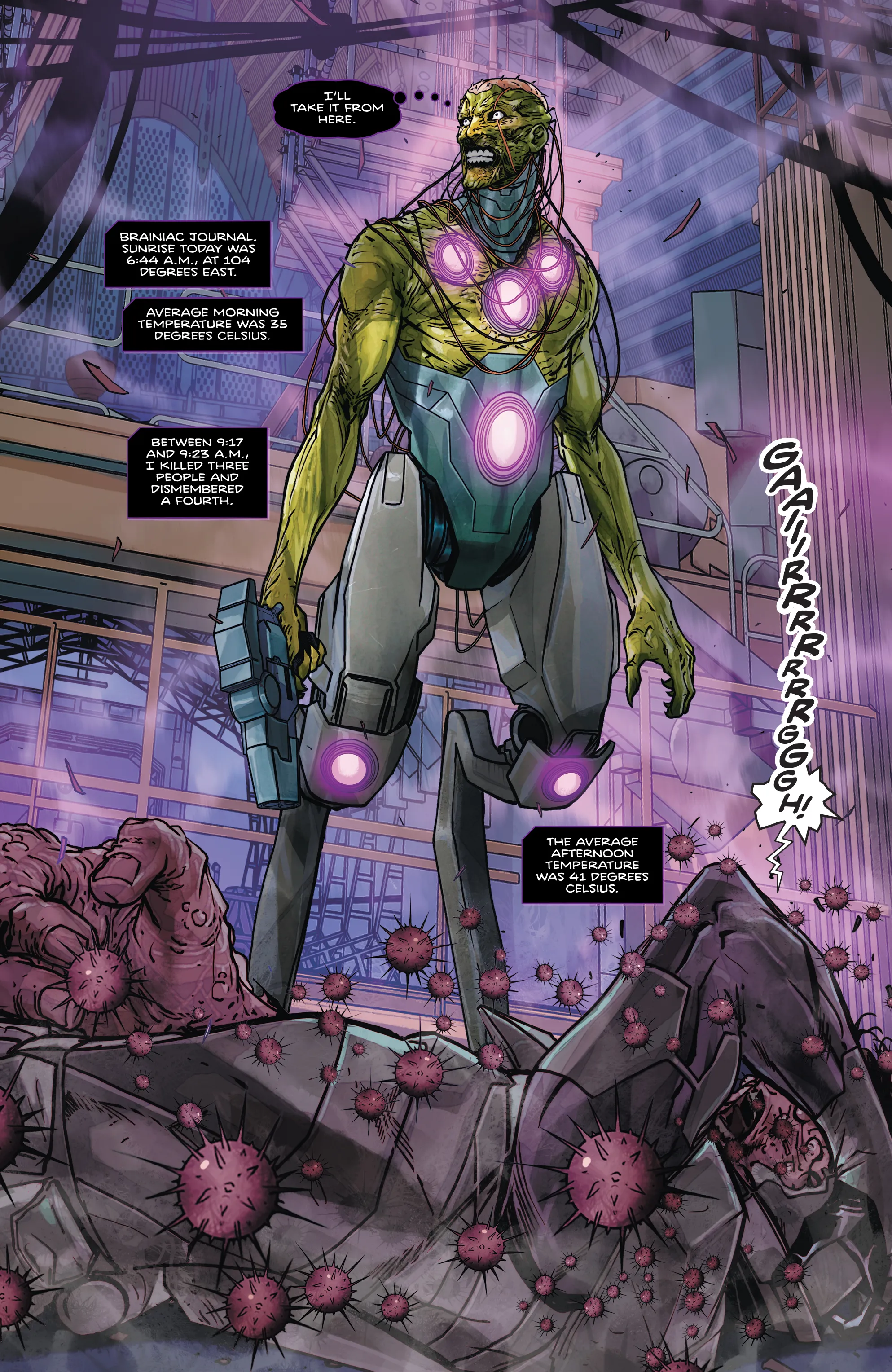 First and foremost, the design of Brainiac indicates so much about the character right at first glance, though your understanding of that will not take full effect until you learn about his history and how he came to be this disturbingly powerful force for Lazarus. As Aaron takes you through moments in Brainiac’s history, you will start to see the true nature of what’s reflected in that present design, and it will all click into place. While he comes across as a bit crazed and unbelievably vicious in that introduction, getting the full context makes that initial imagery even more powerful and disturbing.
