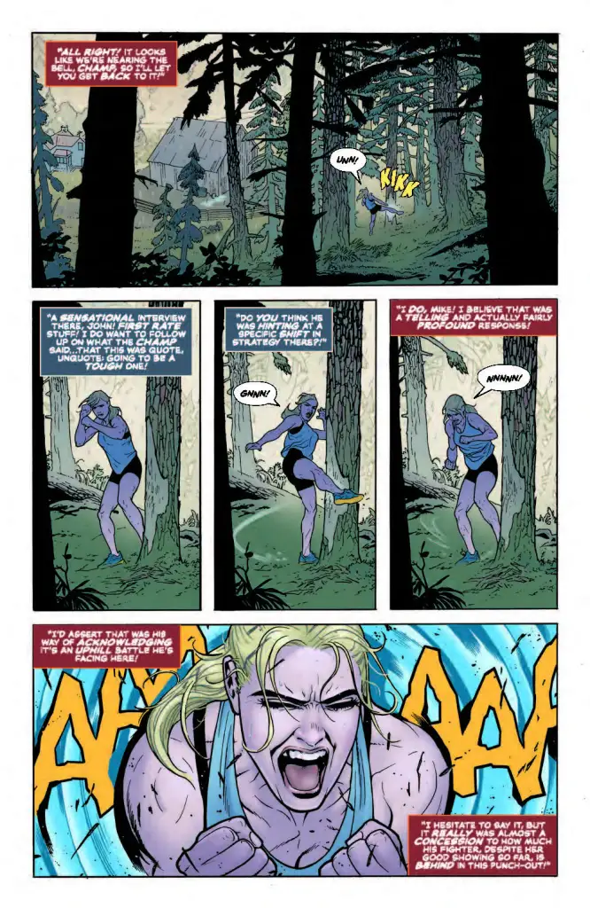 “The thing about this book all the way along, is that you don’t have any of those comic book superhero effects and stuff to fall back on to make the page dramatic or dynamic,” Sook said. “It’s all based on that character, their figure and the emotion that’s coming through them. You don’t have any laser beams. There’s no Kirby dots, there’s no smolder. You know what I mean? It’s all completely stripped away all through the training and all through the fight itself, and it really lends weight to that. You can’t fake it. When she’s standing there, like you said in the ring, and it’s just her and everything goes quiet.”