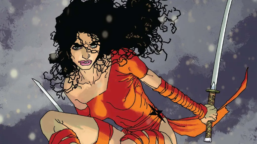 While Daredevil is an old man, Elektra doesn’t look like she’s aged at all. She easily disarms (and beheads) their attackers, but Daredevil has her spare one of the henchmen so he can get information. Instead, Elektra clocks Daredevil across the face with the brunt end of her katana and tells the henchman to run back to his master and tell him they’re coming. Daredevil can tell by Elektra’s voice and body that she hasn’t aged a day in the long decades since they last saw each other.