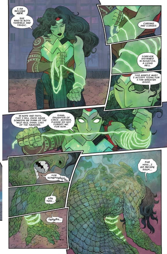 The issue begins with Circe gifting Diana a new weapon, and its name is translated into the word Sacrifice. The weapon in question is a green glowing lasso, and as Circe explains, it gives Diana the ability to transform anything, but what she holds will determine the shape of that transformation.