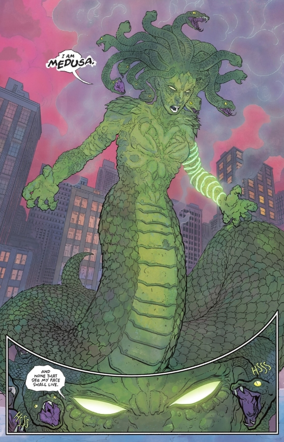 Diana tries to find a weakness in the Tetracide, and it finally becomes clear what she must do. As Circe first told her, whatever she holds will determine the shape of the transformation. Diana puts this into motion by becoming the vessel of the transformation, causing her to fully evolve and transform into the legendary Medusa, complete with the snake-like tail and serpent-filled hair.