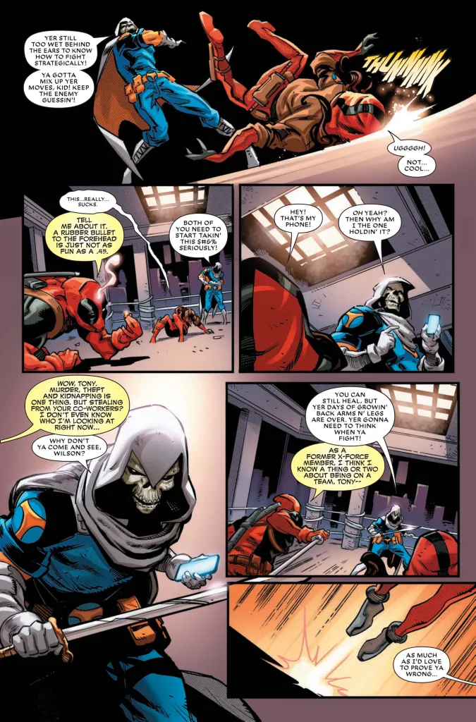 As for the preview of Deadpool #10, Taskmaster wants to reteach Deadpool how to fight. It appears he’s lost some steps while being in the afterlife, so it’s up to Taskmaster to get him and Ellie up to par. Ellie and Deadpool try rushing Taskmaster together, but Taskmaster takes care of that problem by shooting Deadpool in the face with rubber bullets. Ellie doesn’t stand a chance against Taskmaster in a one-on-one fight. After humiliating them both, Taskmaster teleports Deadpool and Ellie into a Russian gang’s hideout. This could be his way of getting Deadpool and Ellie some hands-on training.